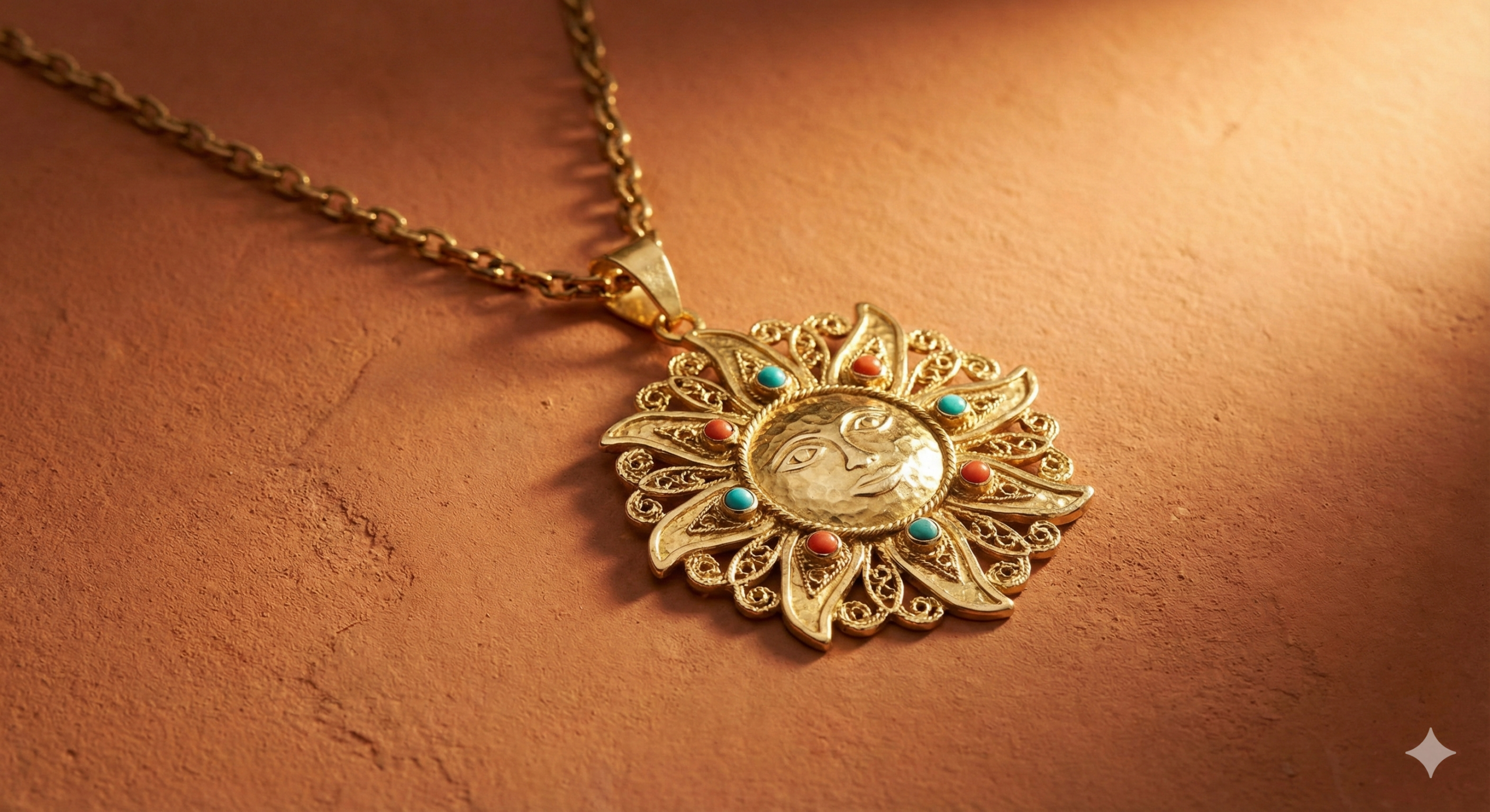 Collar con dije en forma de sol estilo artesanal mexicano, acabado en plata bañada en oro.