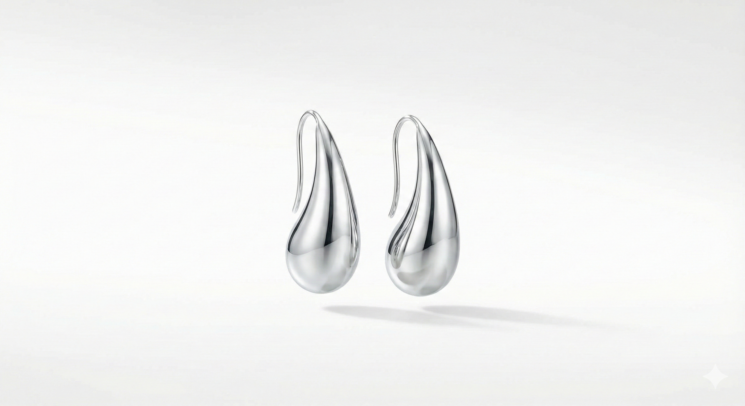Pendientes con forma de gota en plata pulida, reflejan la luz con un brillo elegante.